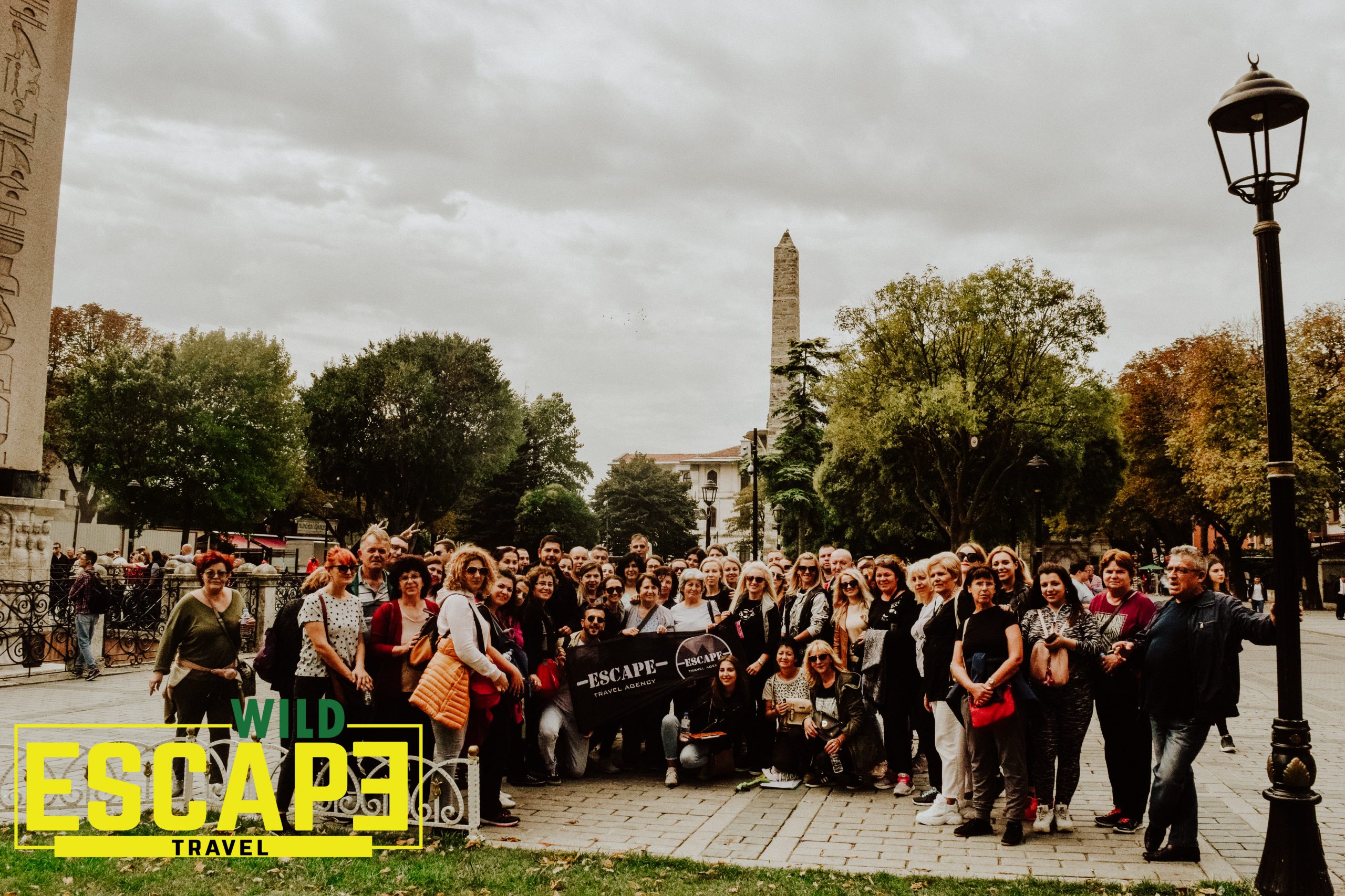 Пристигнувањето на групата во Истанбул. Групата се упатува кон хотелот заедно со својот багаж, каде истиот се остава во просторија предодредена за чување на багаж. Туристичкиот придружник на Ескејп травел е задолжен за комуникација со вработениот на рецепцијата во хотелот каде според список на уплати во канцелариите на агенцијата се делат клучевите од хотелските соби. Од досегашното работно искуство, нашата агенција вложила доста напори да им овозможи сместување на патниците пред законското време за Check in во хотелот. Патниците добиваат слободно време за пауза, а остатокот од денот предвиден за истражување на најголемиот град во Европа, градот Истанбул. Започнуваме со пешачката тура која што започнува од хотелите, се движиме кој Капали Чаршија каде што ќе имате можност да прошетате со локален водич. После Капали Чаршија се упатуваме кој Хиподром и Сината Џамија. Слободно време за фотографирање и прошетка околу Хиподром. Последна посета од пешачката тура е Аја Софија, поранешна црква и музеј која што денес е претворена во џамија.