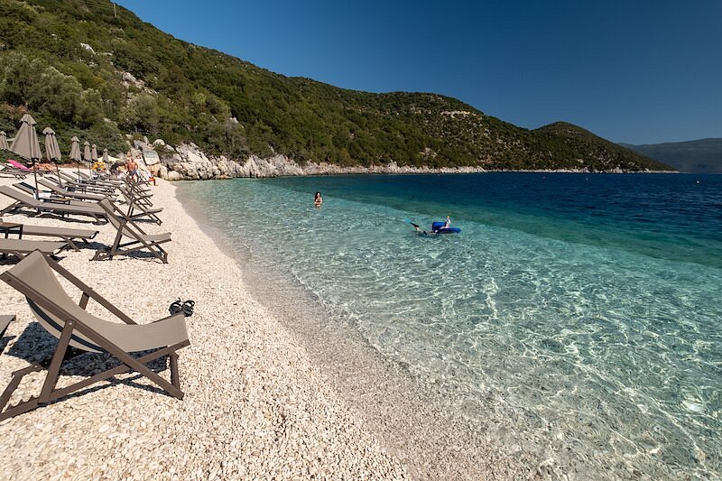 Најубава плажа на островот е познатата Myrthos Beach која се наоѓа на Северозападниот дел на Кефалонија, која е заштитен знак на островот. Плажата е 12 пати прогласувана за најубава плажа во Грција. Оваа плажа е со бели камчиња и токму заради тоа бојата на морето е сина како на сликовница, оваа плажа многу наликува на плажите на Лефкада. Овој ден продолжуваме и на плажа Макрос Гиалос, во beach bar Costa Costa, каде што ќе можете да уживате со музика, релаксација на плажа или водни спортови.