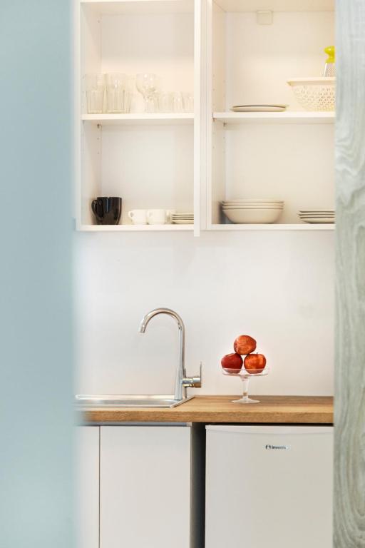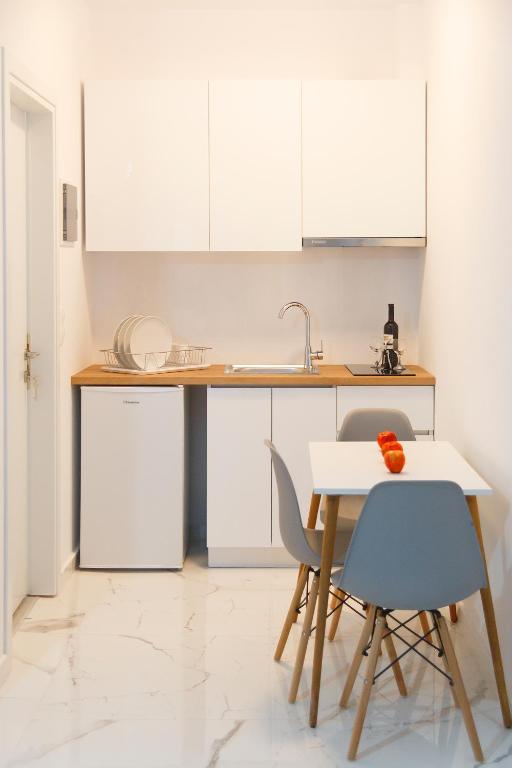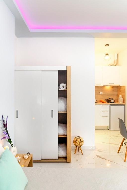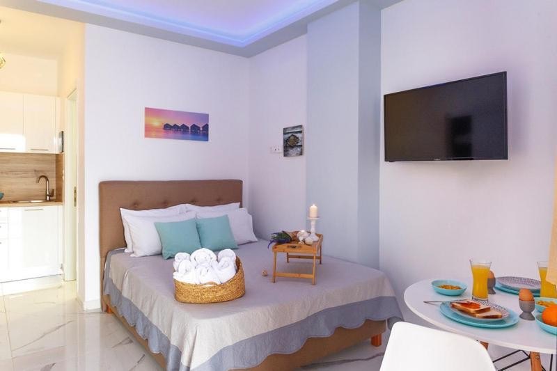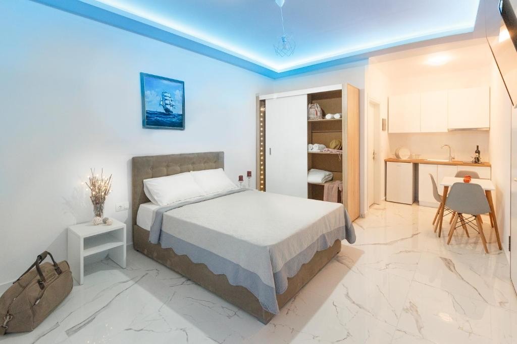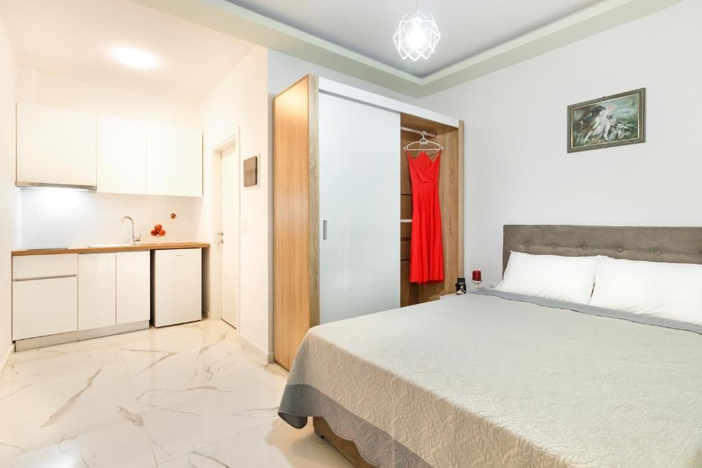 Студио број 1 е наменето за сместување на 4 лица (2 возрасни и 2 деца до 12 години). Студијата се опремени со еден брачен кревет и 2 креветчина на спрат. Секое студио има тоалет, мини кујна, ТВ, тераса и се наоѓаат на прв спрат.Студио број 1 е со поглед кон улицата која води до плажа.