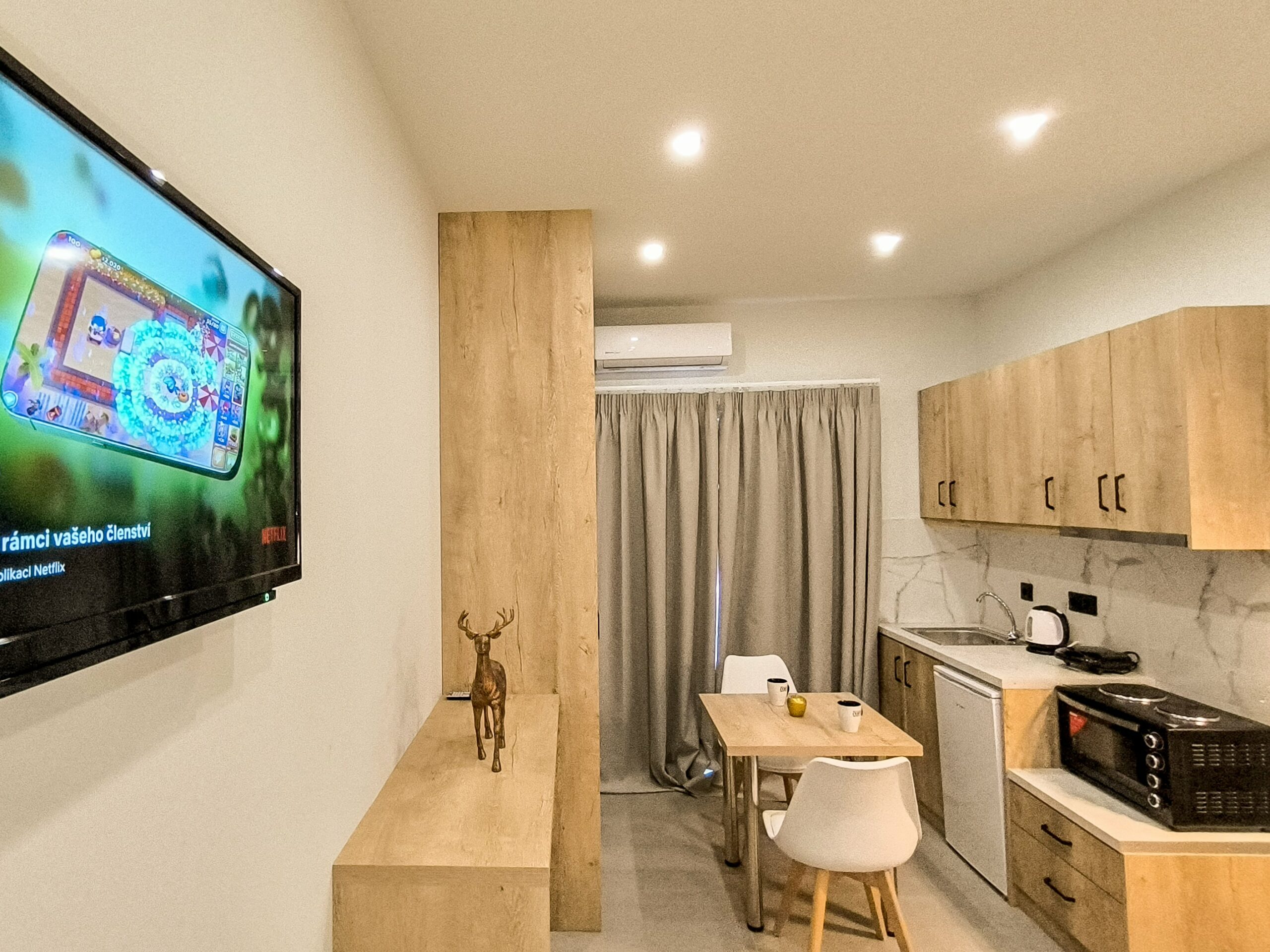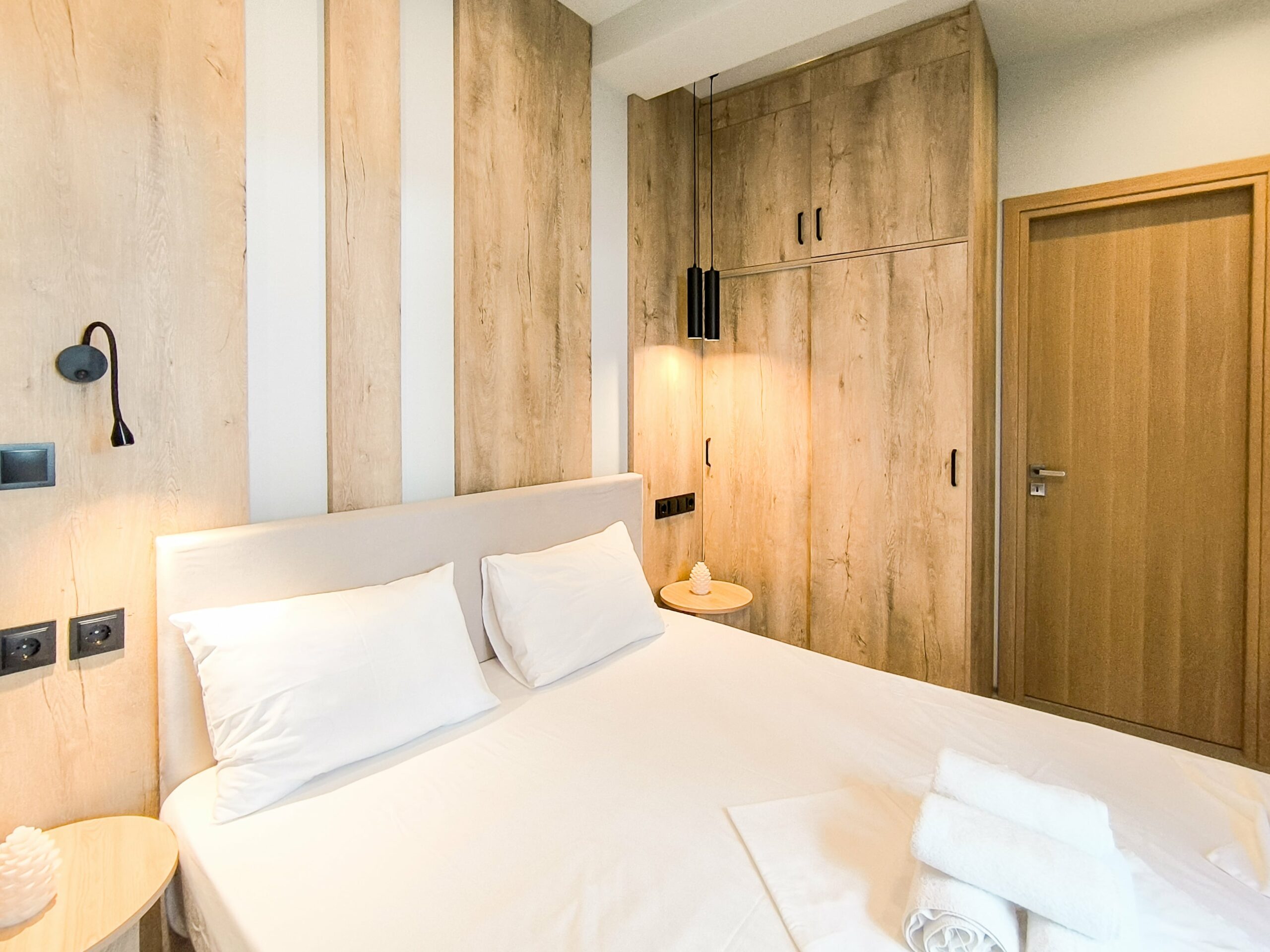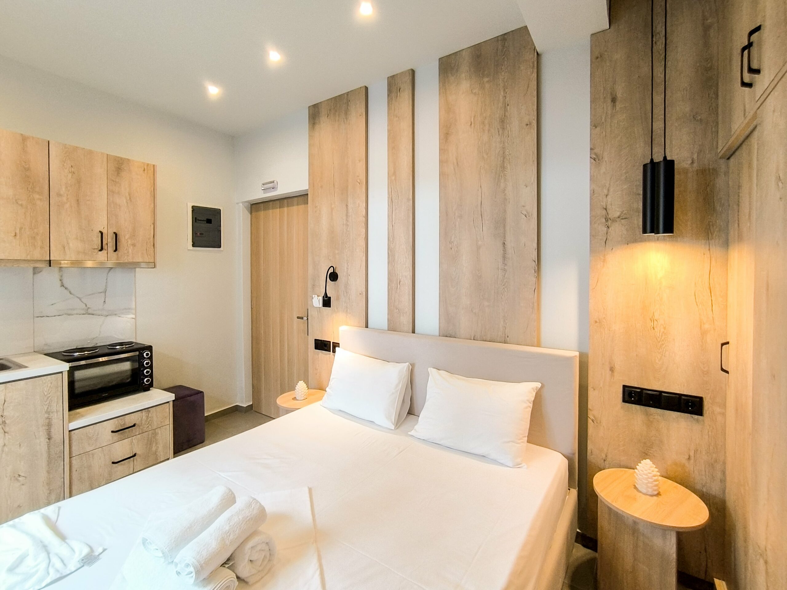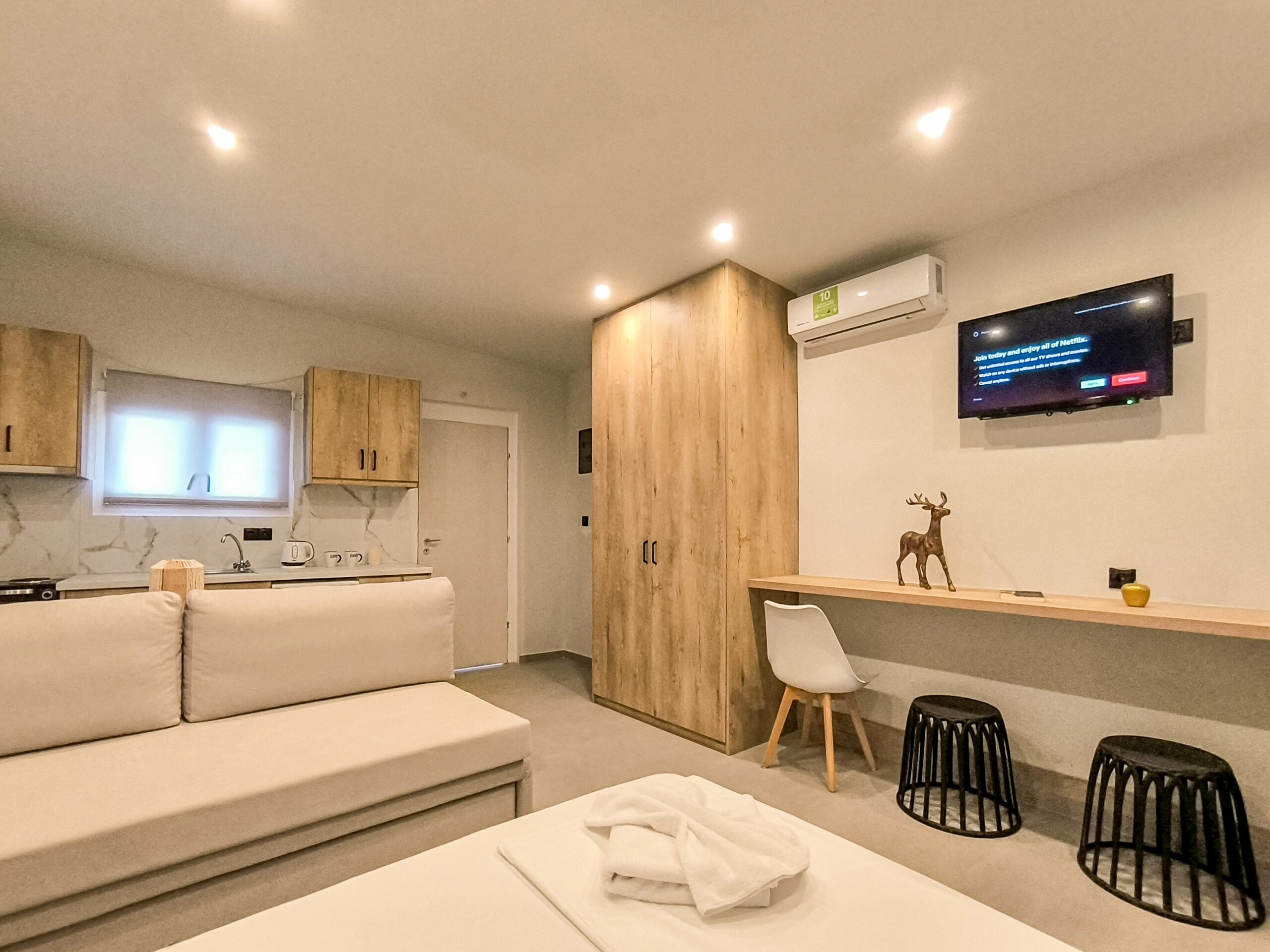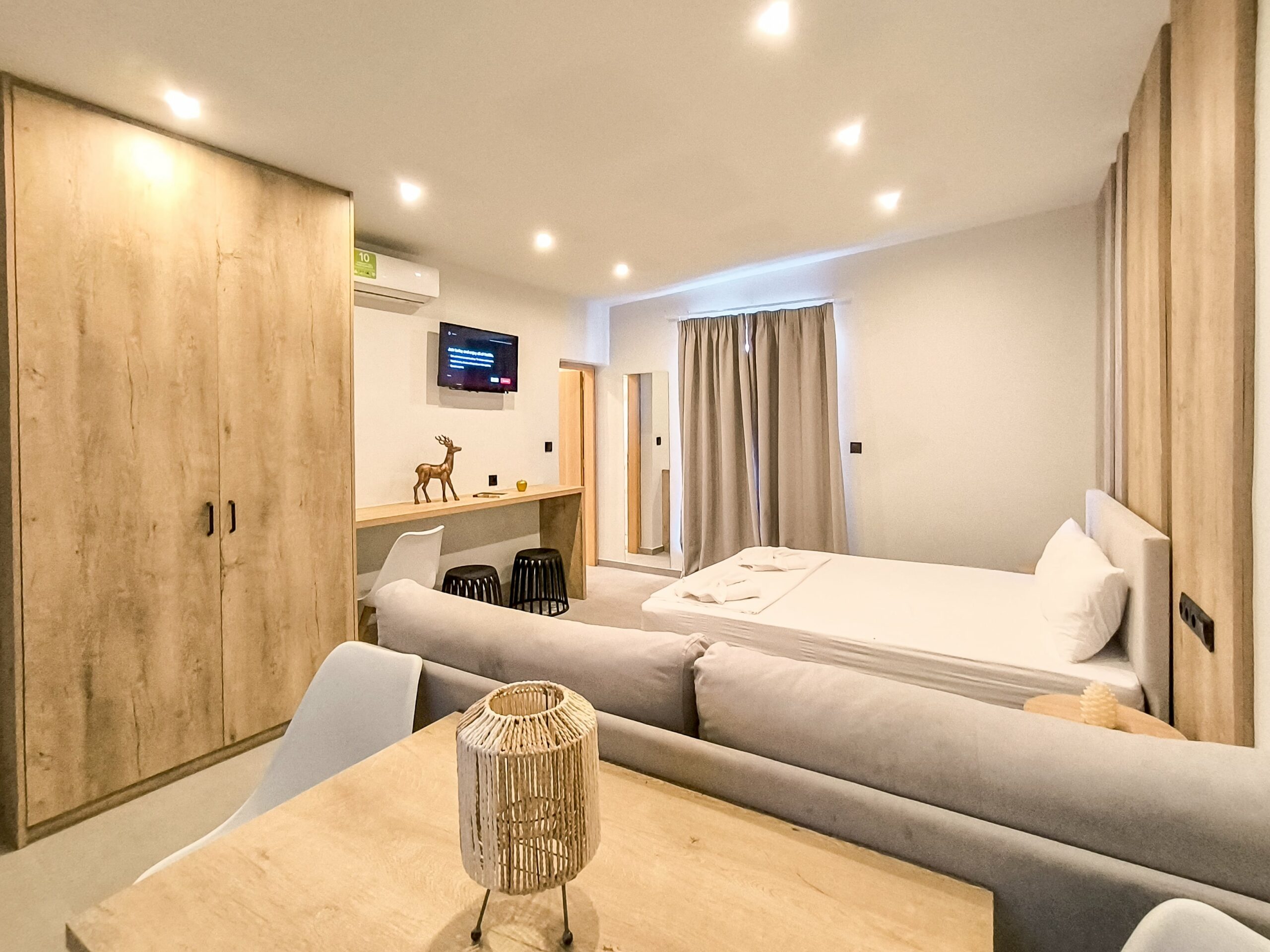Студио број 4 нуди сместување за 3 лица. Студиото располага со еден брачен кревет и еден кревет на извлекување.