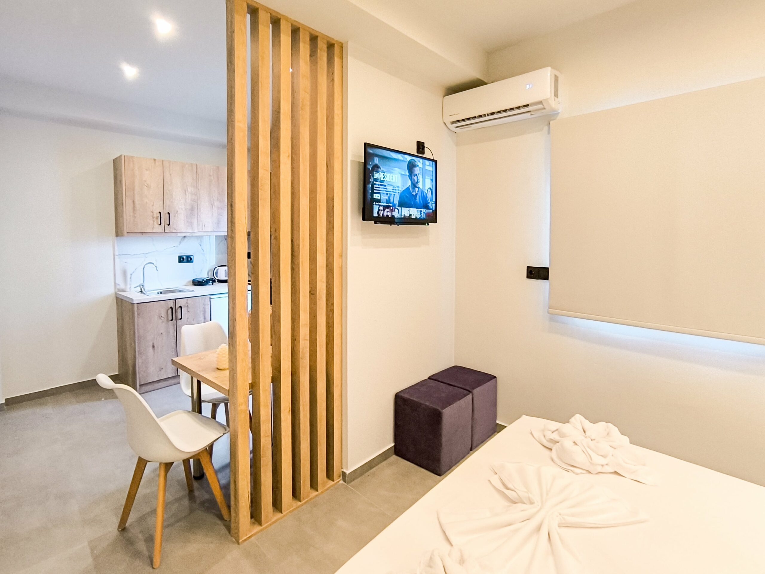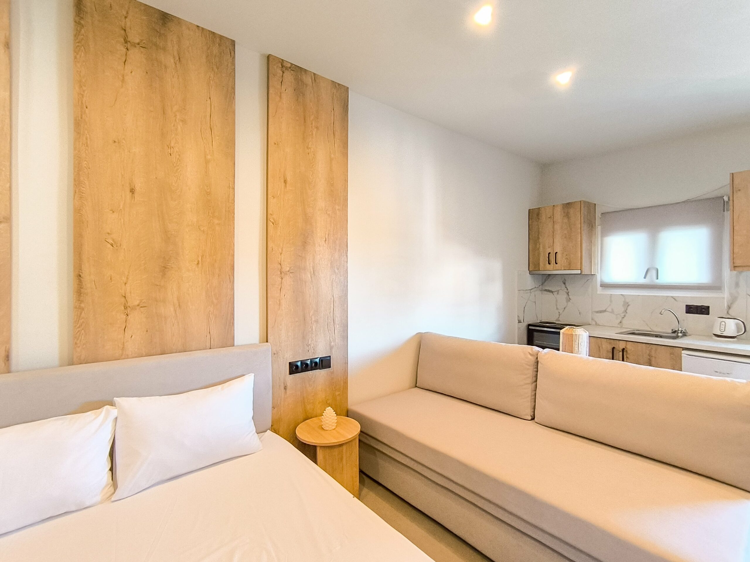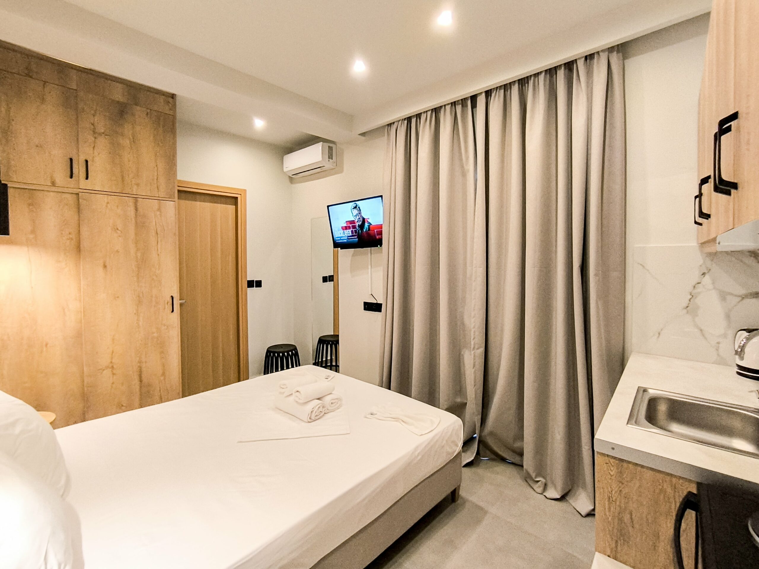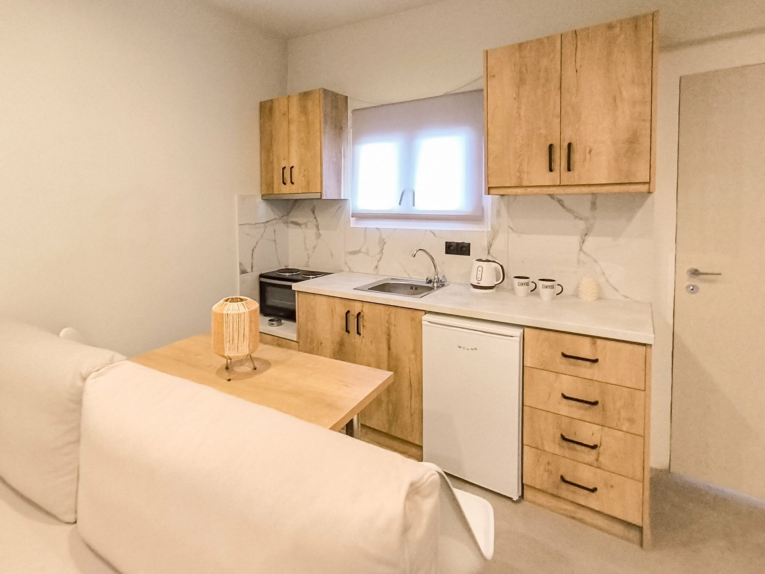 Студио број 4 нуди сместување за 3 лица. Студиото располага со еден брачен кревет и еден кревет на извлекување.