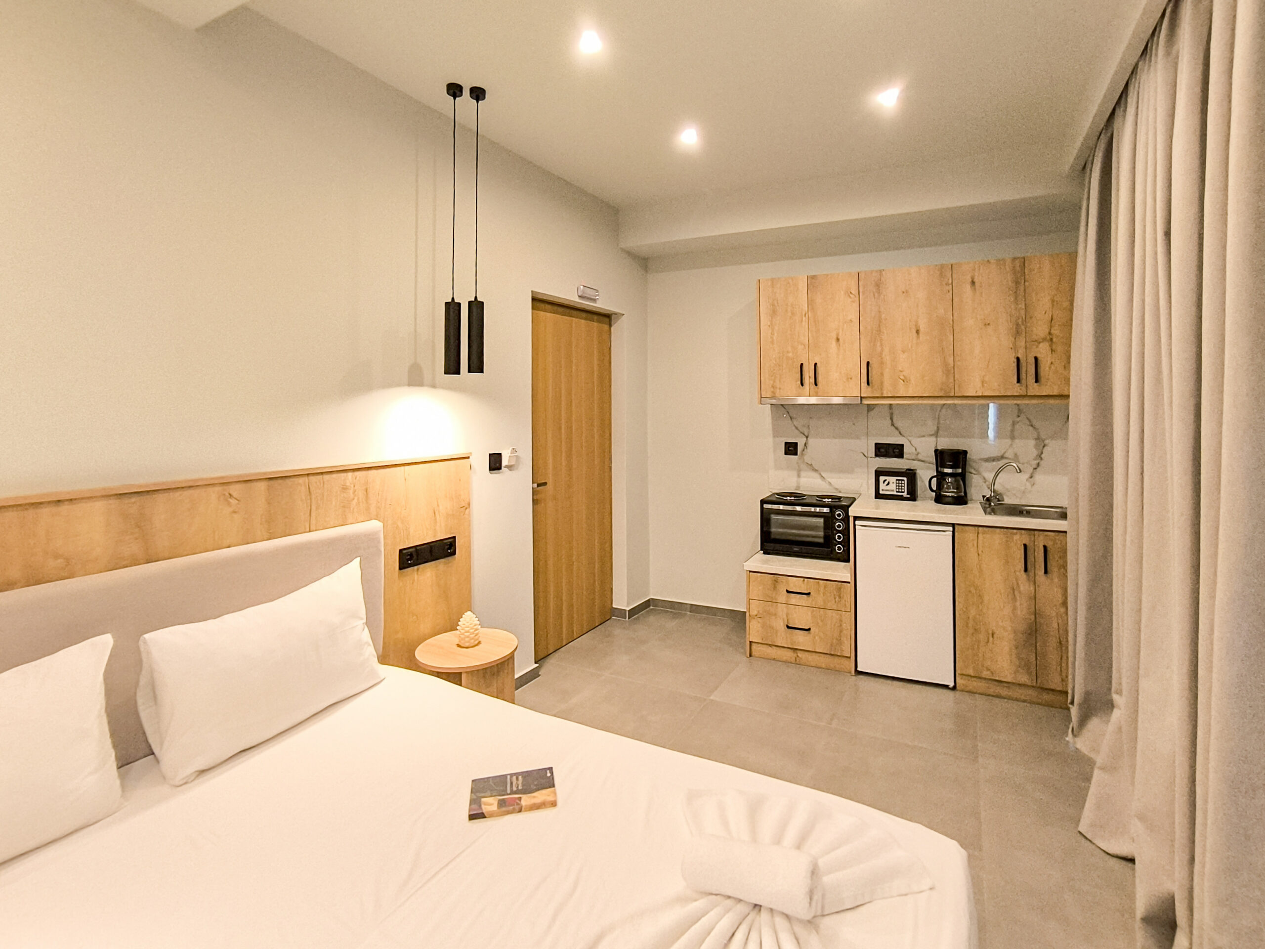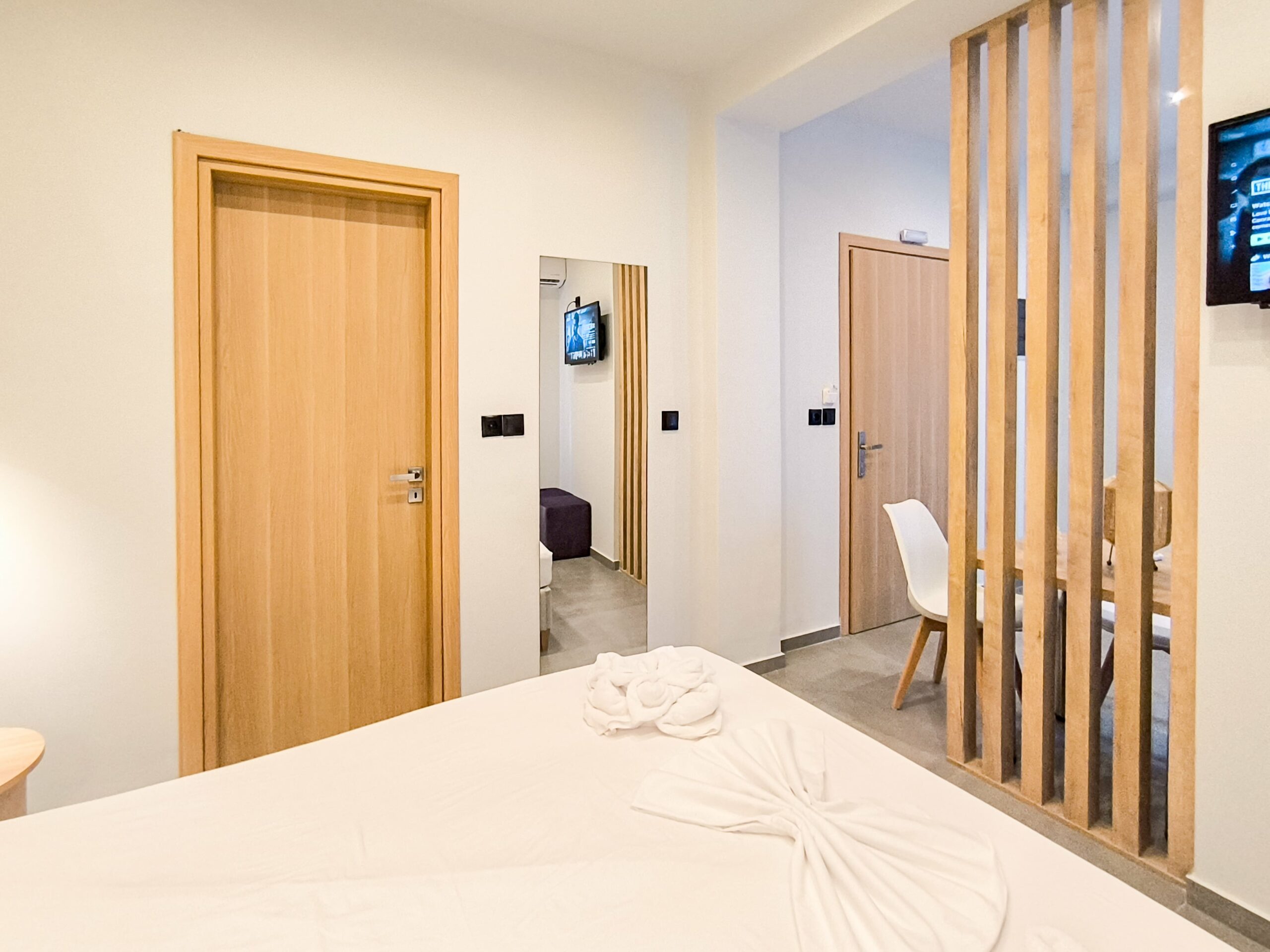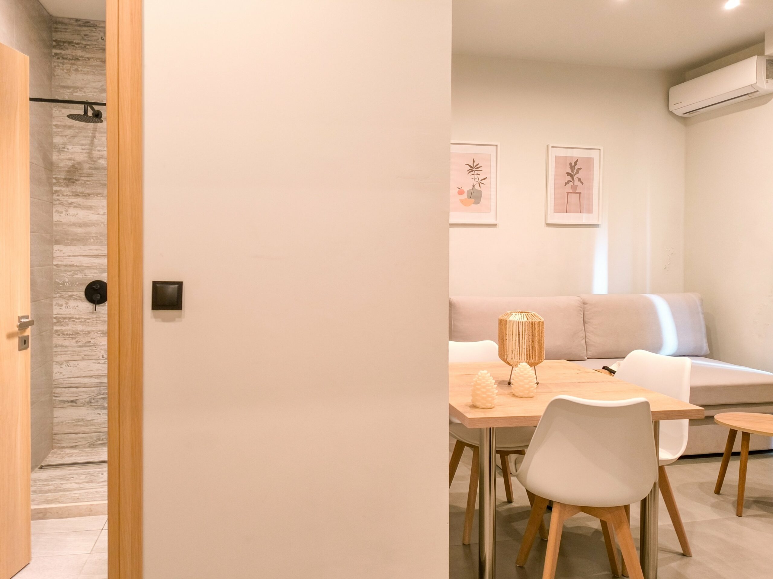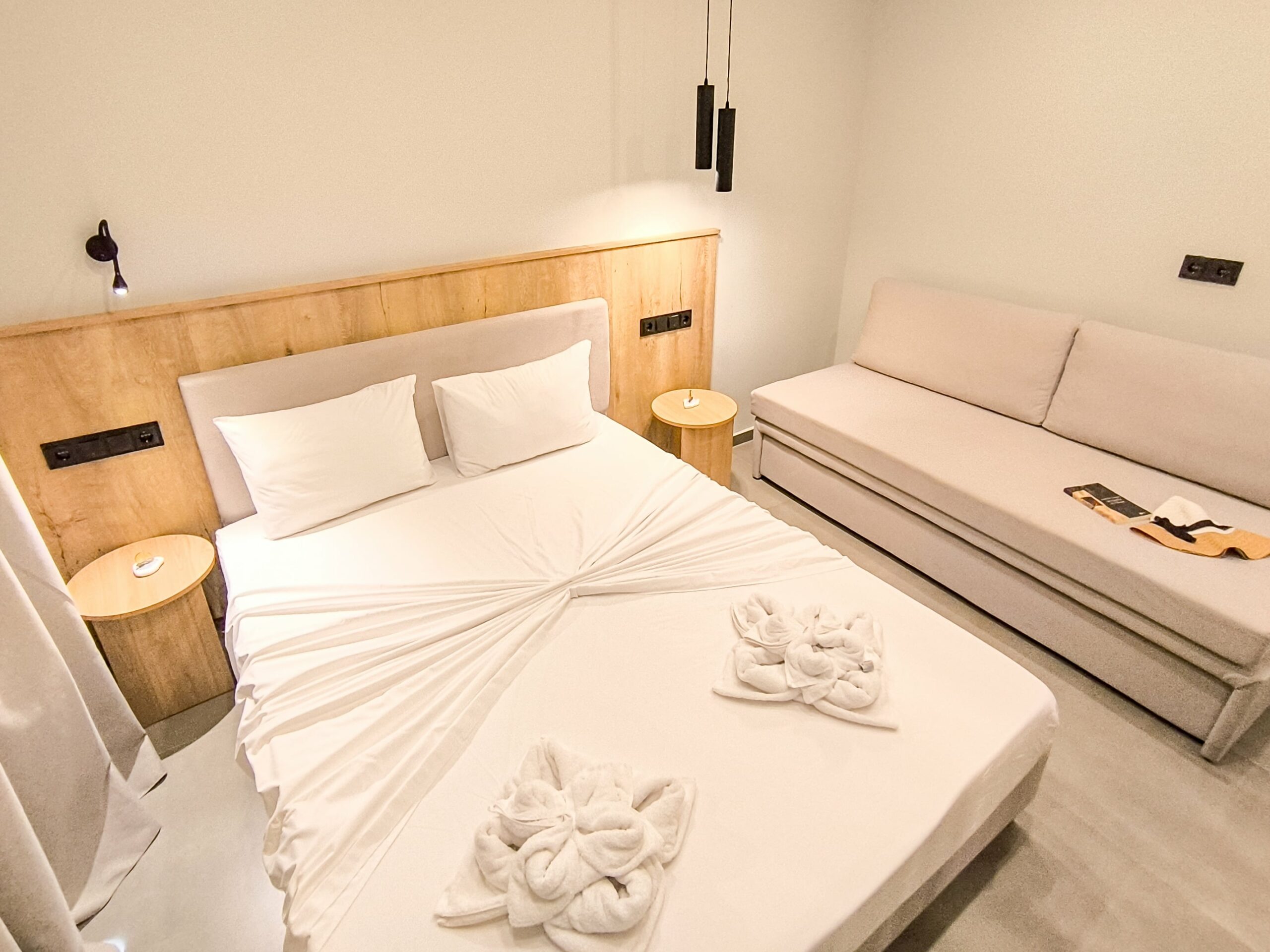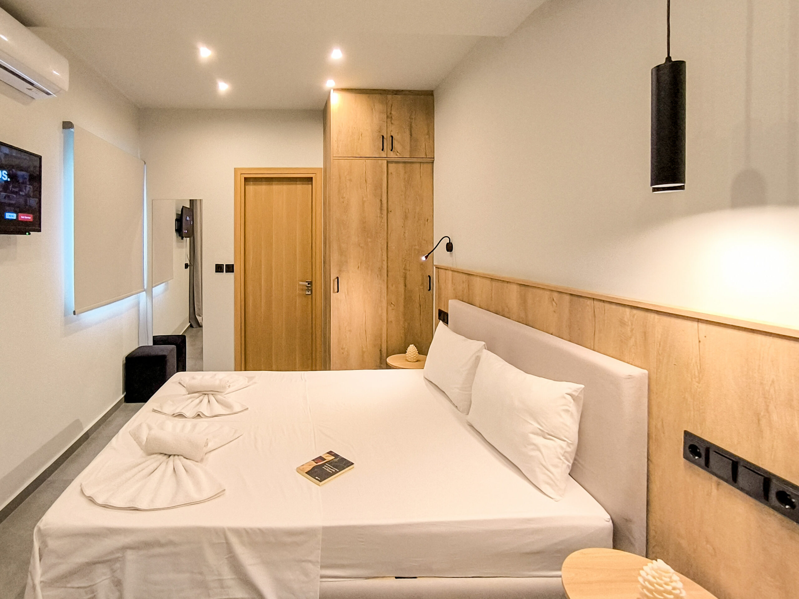 Студио број 4 нуди сместување за 3 лица. Студиото располага со еден брачен кревет и еден кревет на извлекување.