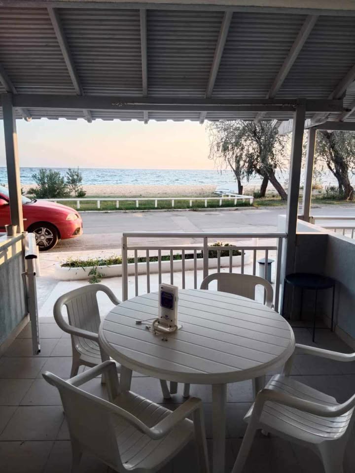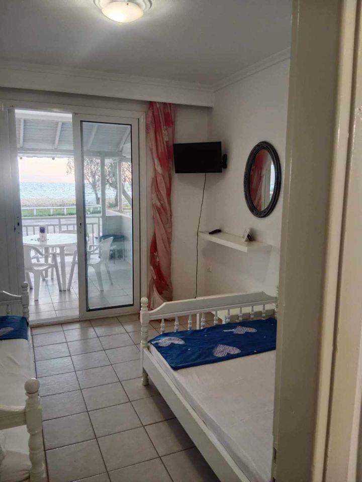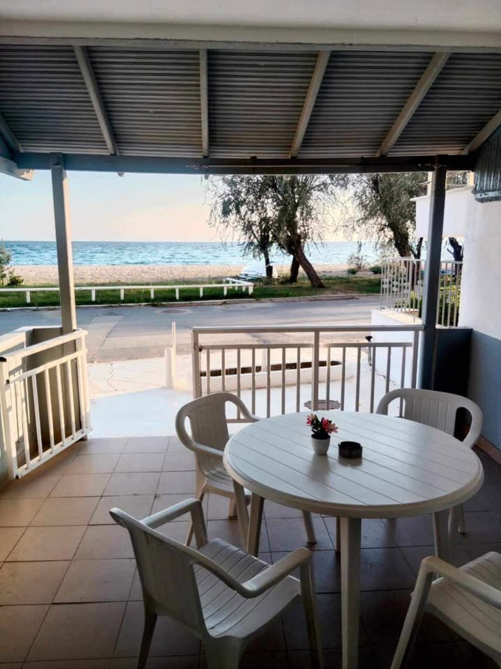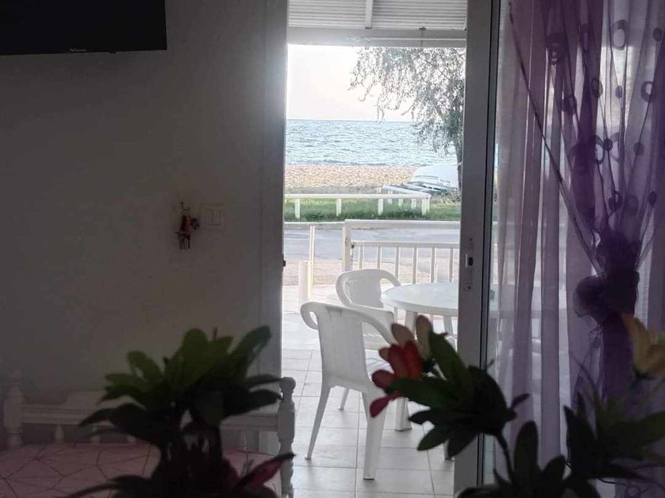 ВИЛА КИКИ во Флогита. Апартман I3 на приземје, за 3-4 лица, на 30 метри од плажа и со директен поглед на море.Станот се состои од бања, тоалет, тераса, кујна и посебна спална соба. Собата има еден брачен кревет и еден единечен кревет. Доколку е потребно, може да се додаде дополнителен кревет во кујната. Опремена кујна за приготвување и послужување храна и пица. Клима и Wi-Fi се вклучени во цената.
