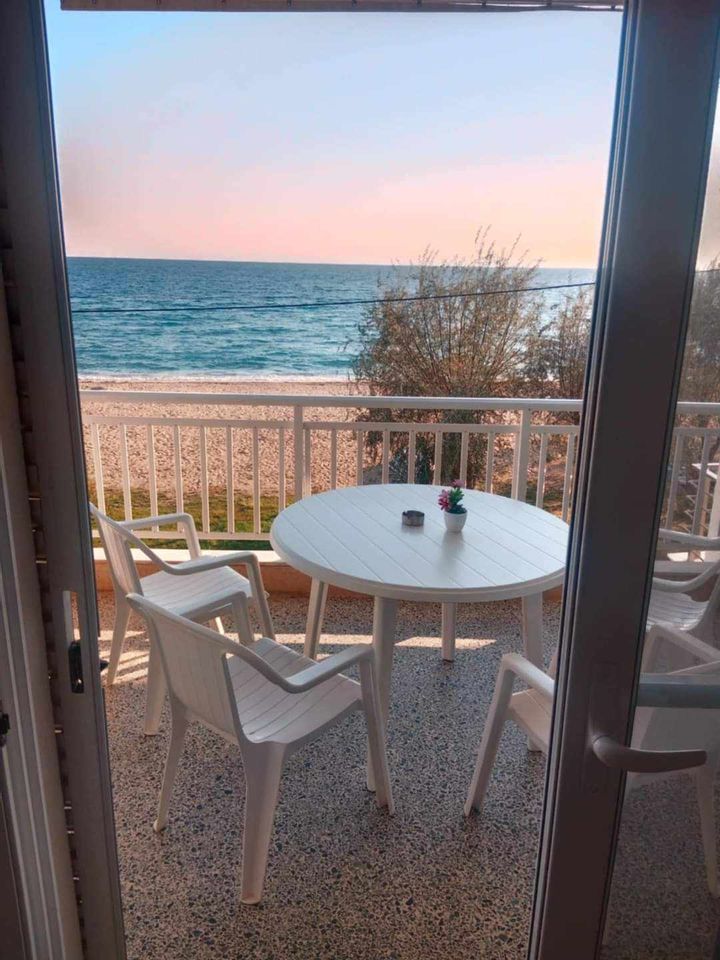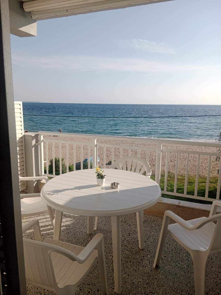 ВИЛА КИКИ во Флогита. Апартман B3, на втор кат, за 3-4 лица, на 30 метри од плажа и со директен поглед на море.Станот се состои од бања, тоалет, тераса, кујна и посебна спална соба. Собата има еден брачен кревет и еден единечен кревет. Доколку е потребно, може да се додаде дополнителен кревет во кујната. Опремена кујна за приготвување и послужување храна и пица. Клима и Wi-Fi се вклучени во цената.