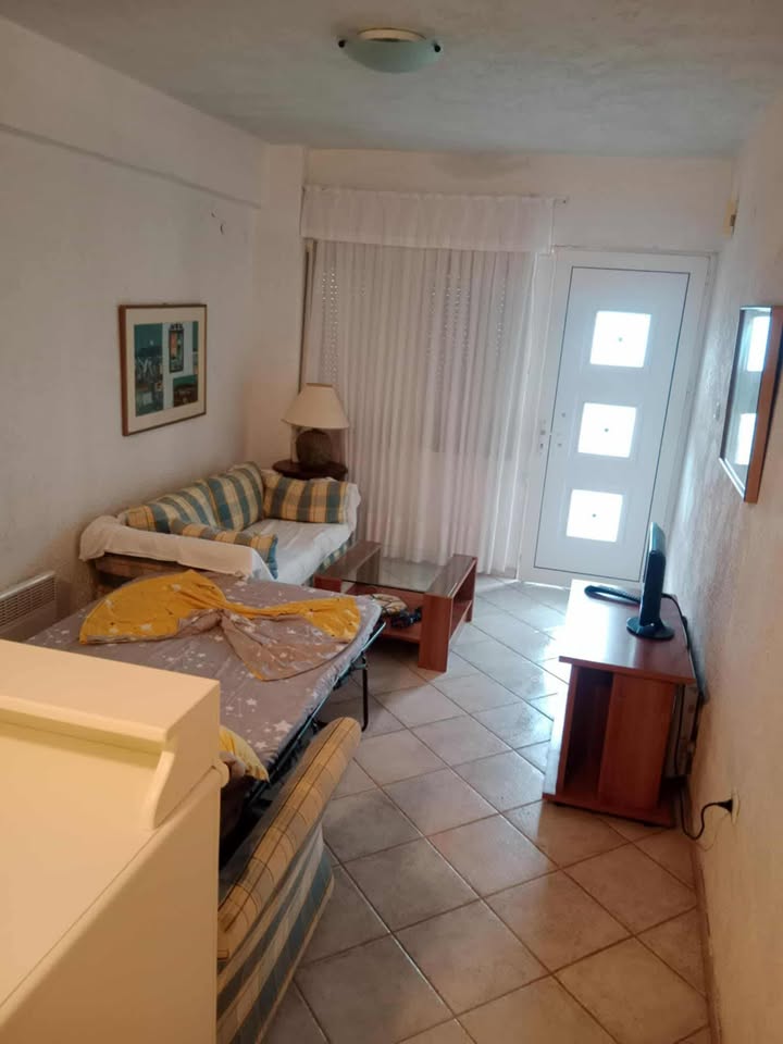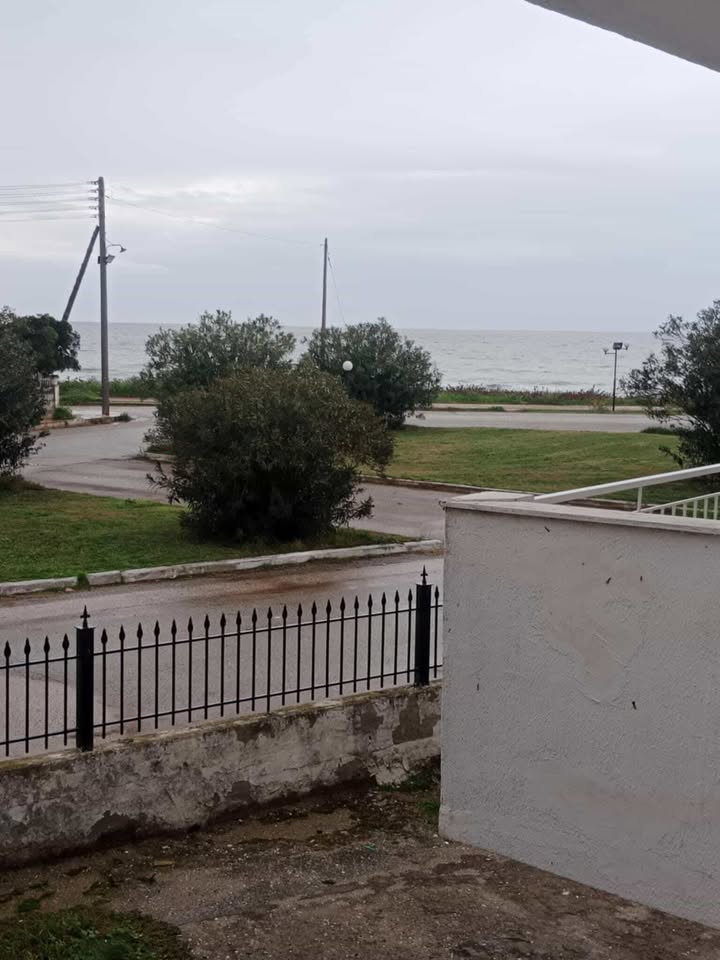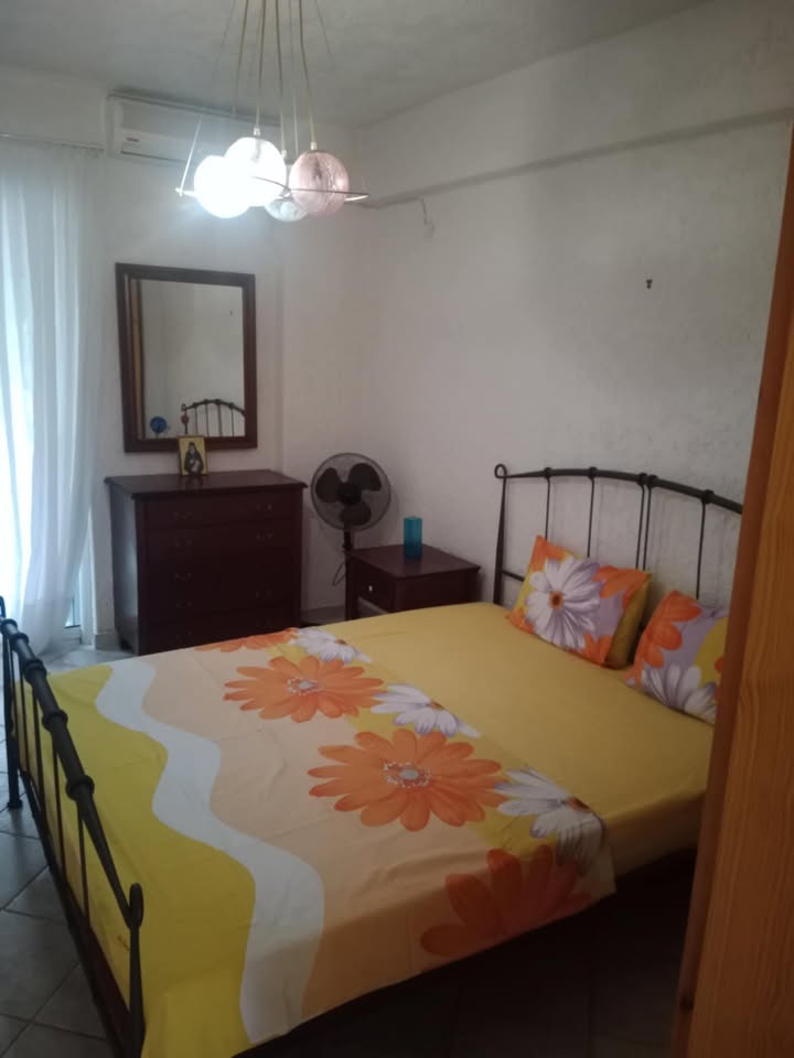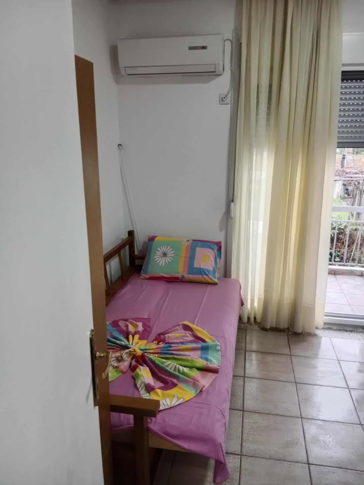 За 5-6 лица. 70 метри од морето со страничен поглед на морето. Има една соба со брачен кревет и друга соба со брачен кревет на расклопување и еден единечен кревет. Можност за еден дополнителен кревет на расклопување. Кујна опремена за подготовка и сервирање храна и пица. Клима уредот и Wi-Fi се вклучени во цената. Апартманот се наоѓа на високото приземје и, покрај големата тераса напред, има и помала на задниот дел.