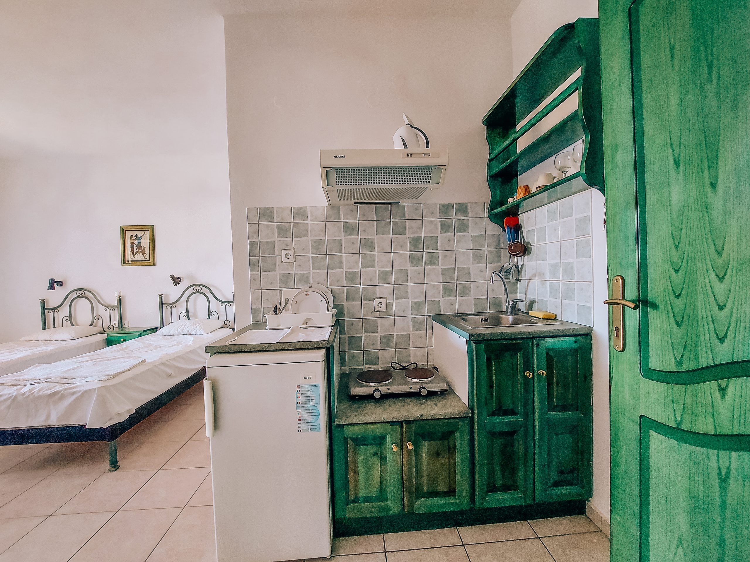 Вилата располага со двокреветни и трокреветни студија на првиот спрат. Од дел од студијата може да се набљудува морето, а останатите нудат погед кон пејсажниот остров. Студијата се опремени со мини кујна за подготовка на лесни оброци, фрижидер, прибор според бројот на гости, ТВ, плакар, тераси со столчиња и маса и Wi-Fi, и тоалет. Две од студиата се со брачен кревет, броеви 3 и 7 сите останати се со единечни кревети.