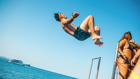 Подгответе се за единствената журка на брод. По загревањето во нашиот бар, тргнуваме на неколку часа не заборавна журка на брод и бањање на преубавите заливи и плажи на островот Маратонизи..
